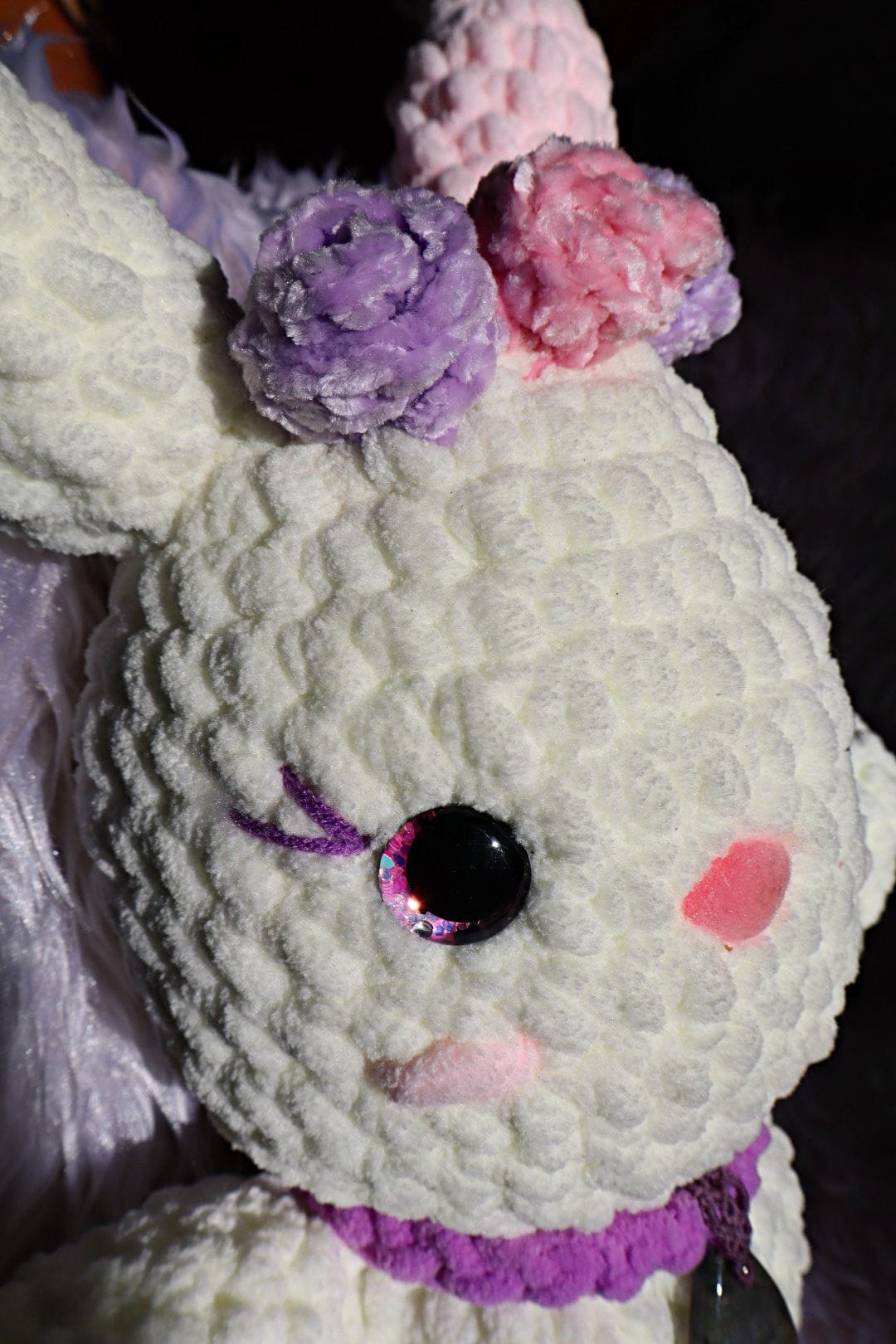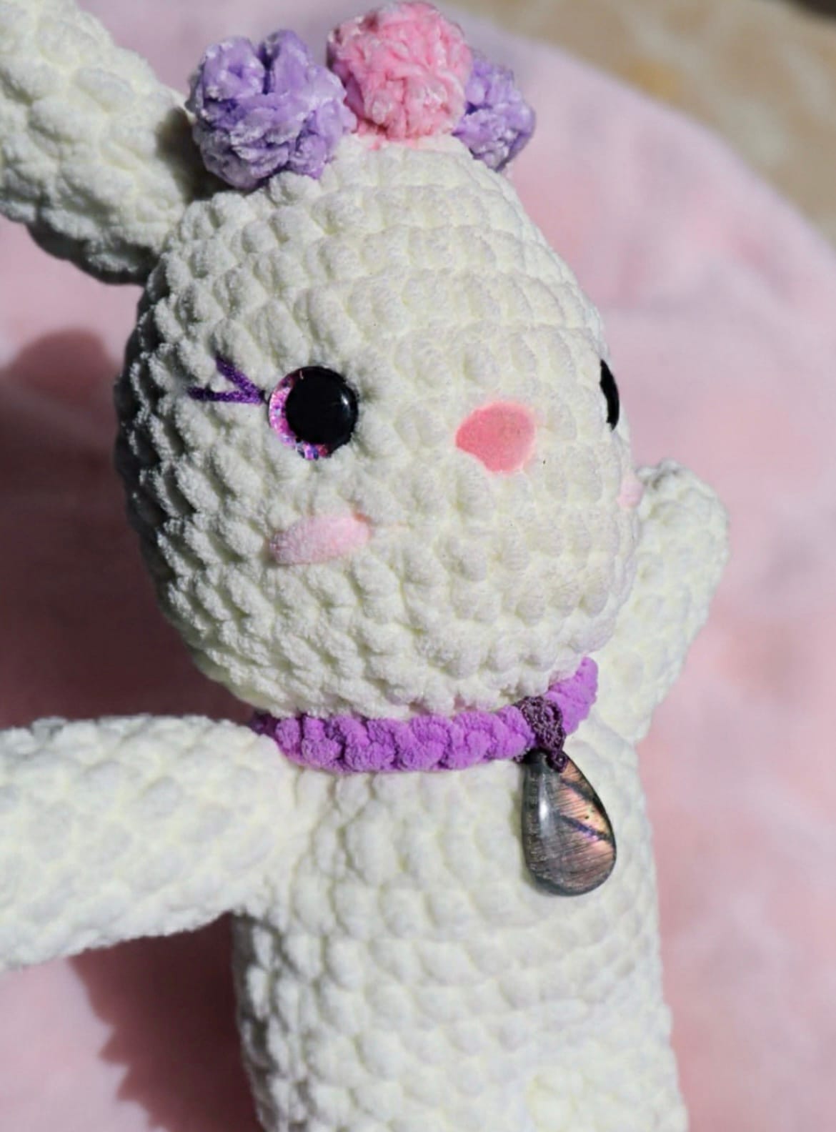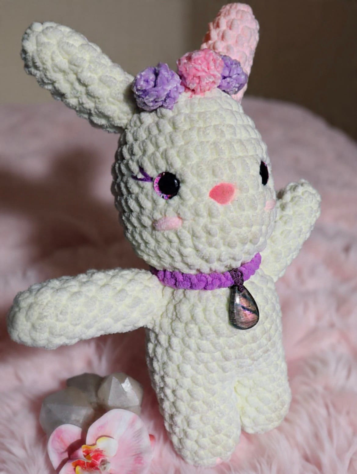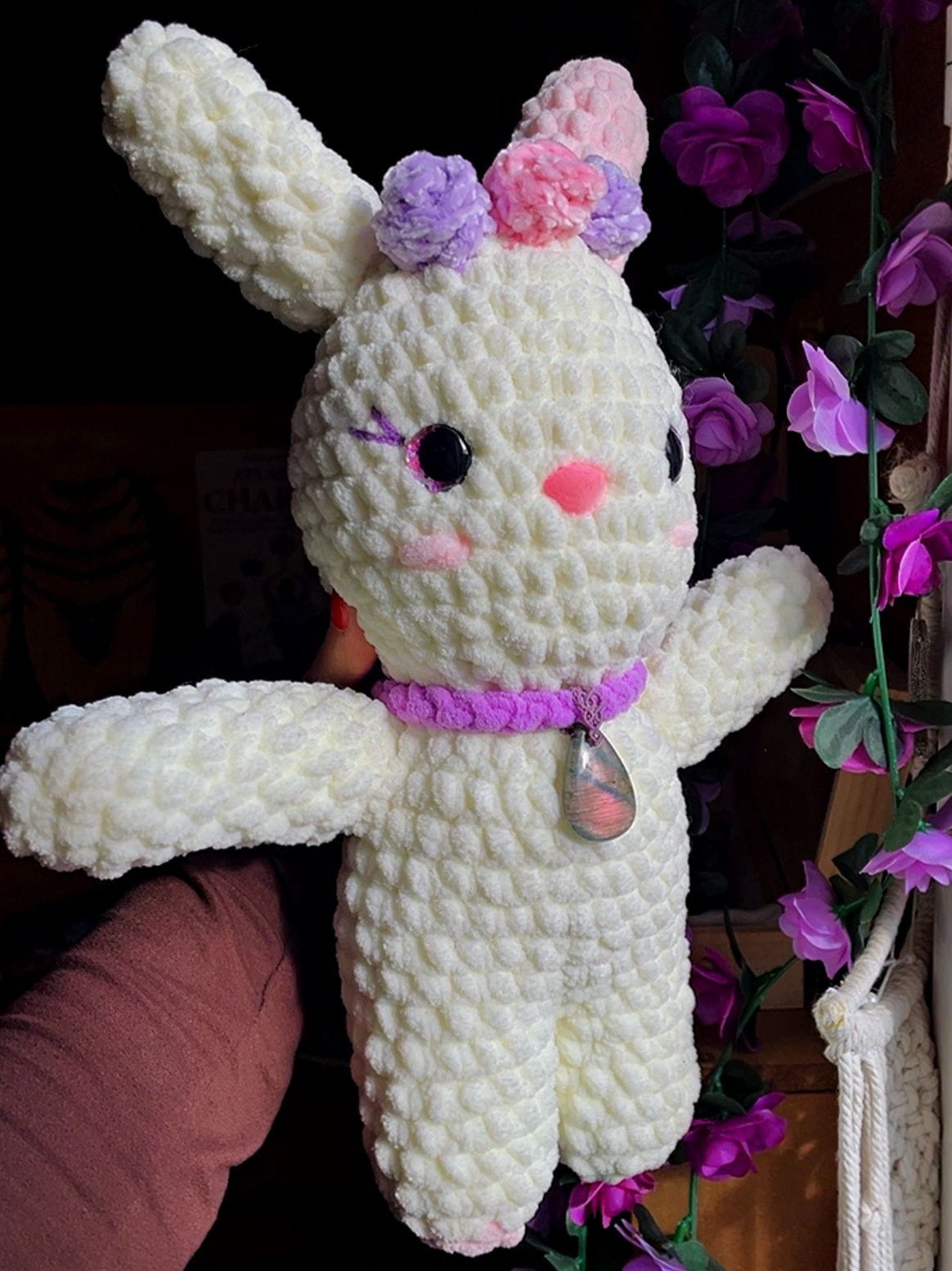 Entièrement crochetée à la main, cette lapine est née sous le signe de l’équinoxe, ce moment précieux où la lumière et l’ombre s’équilibrent. Elle porte avec elle l’énergie du renouveau, des premières fleurs et des jours qui s’allongent doucement.