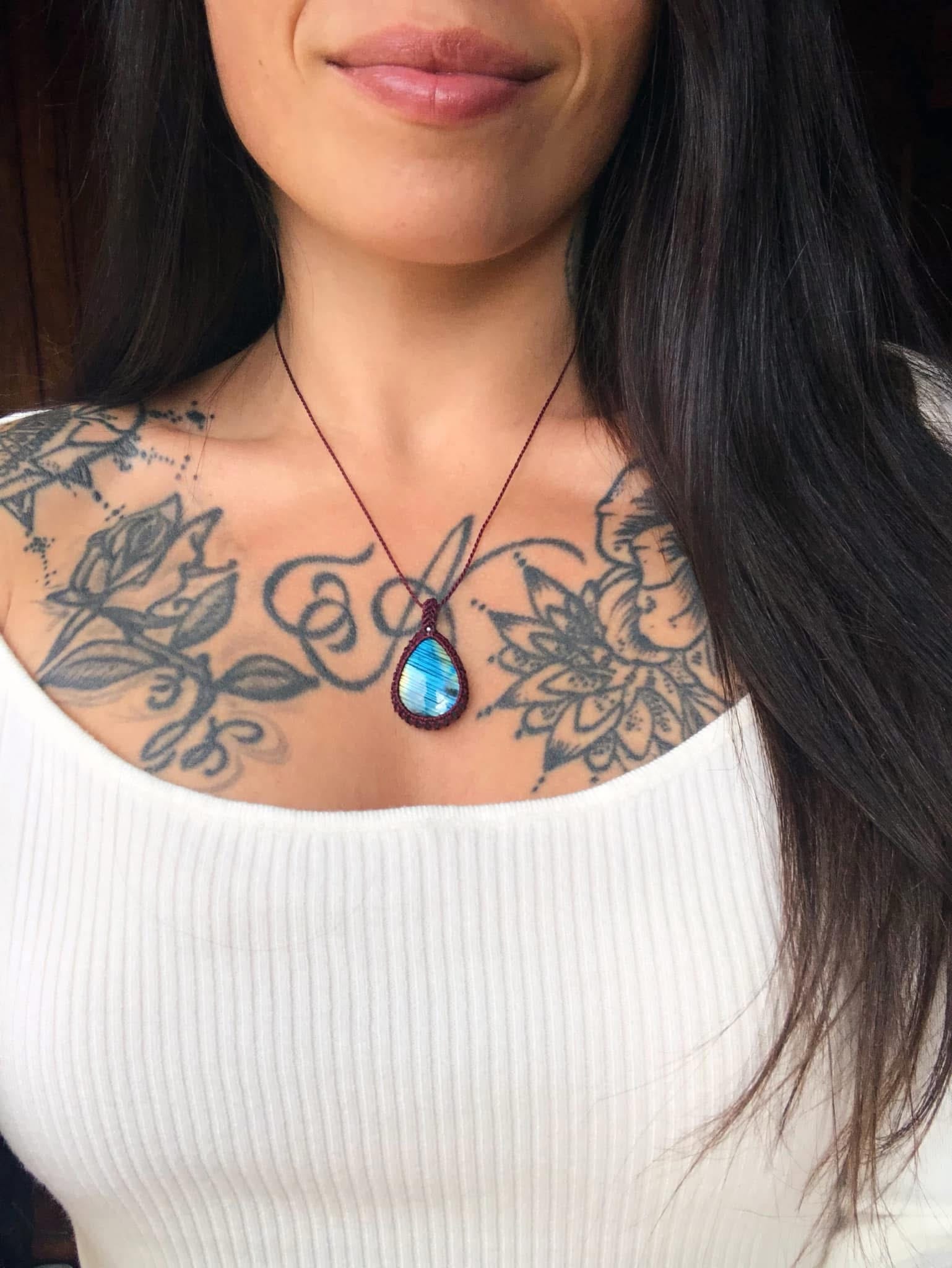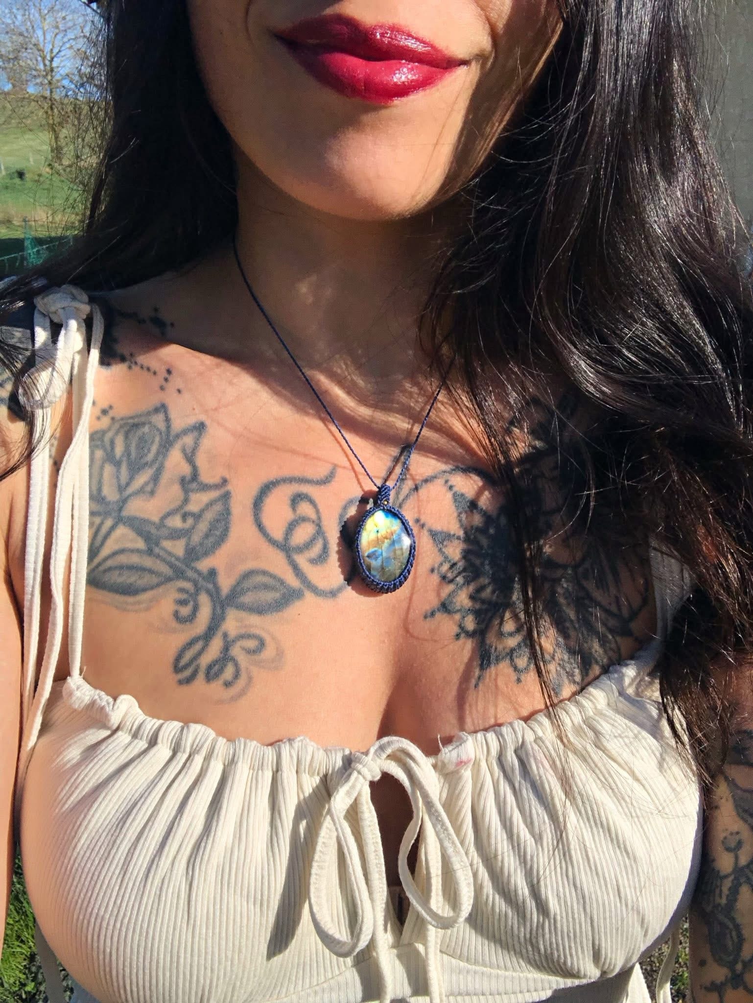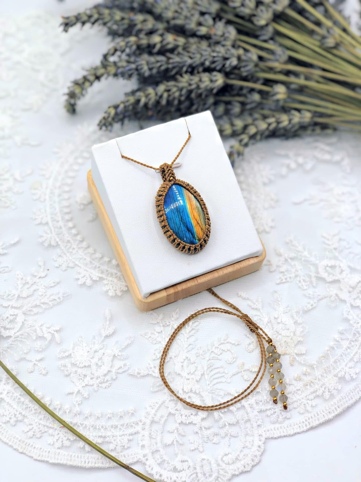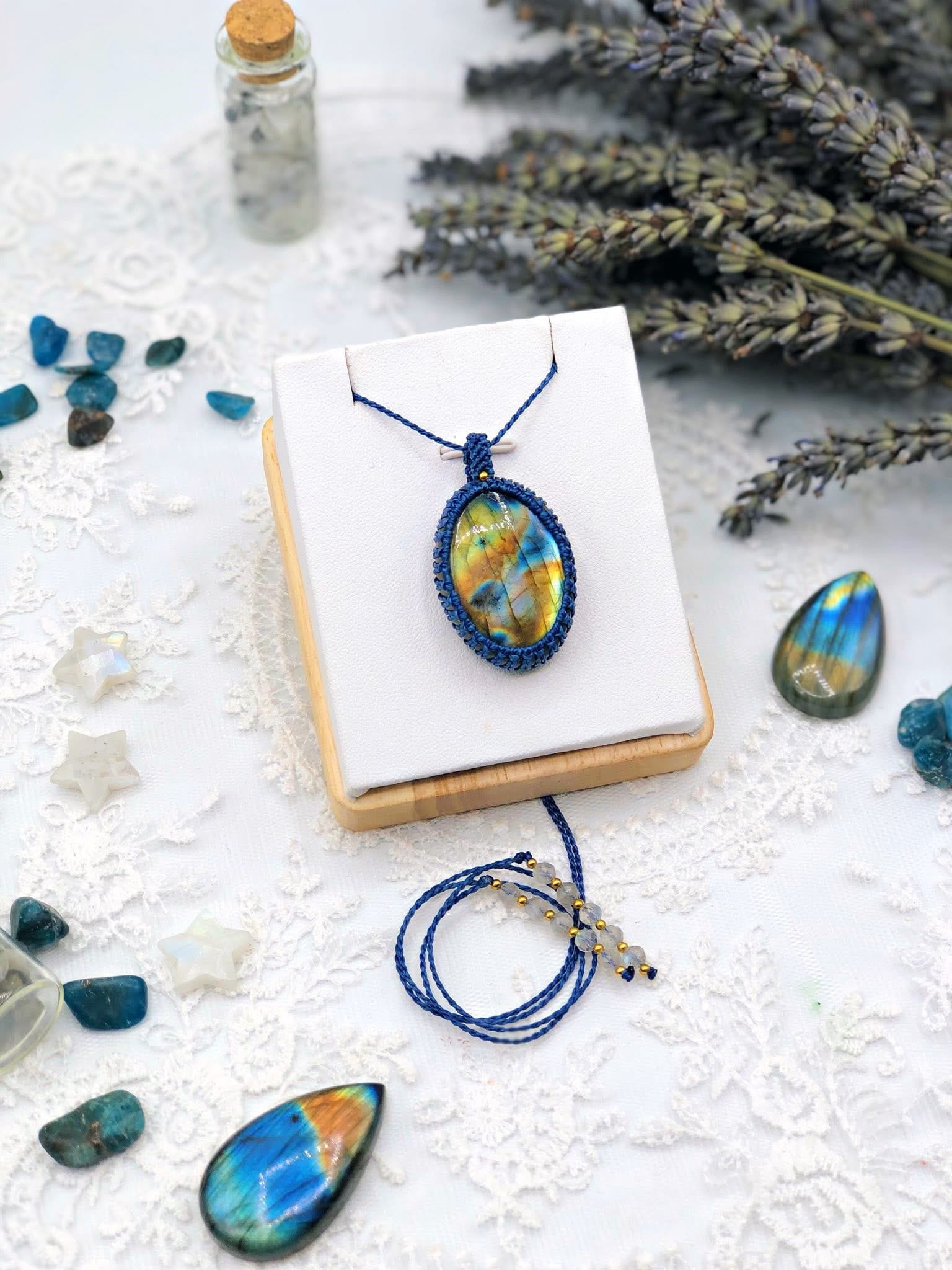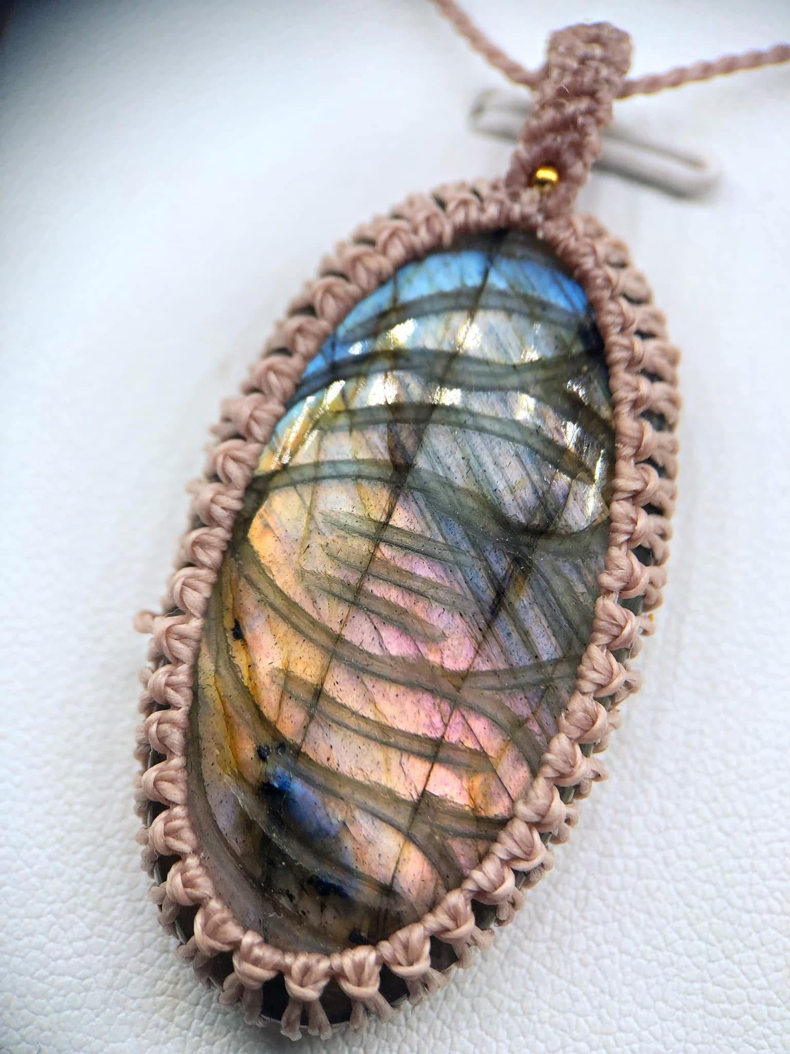 • Le pendentif est une Labradorite sertie en micro macramé fin.