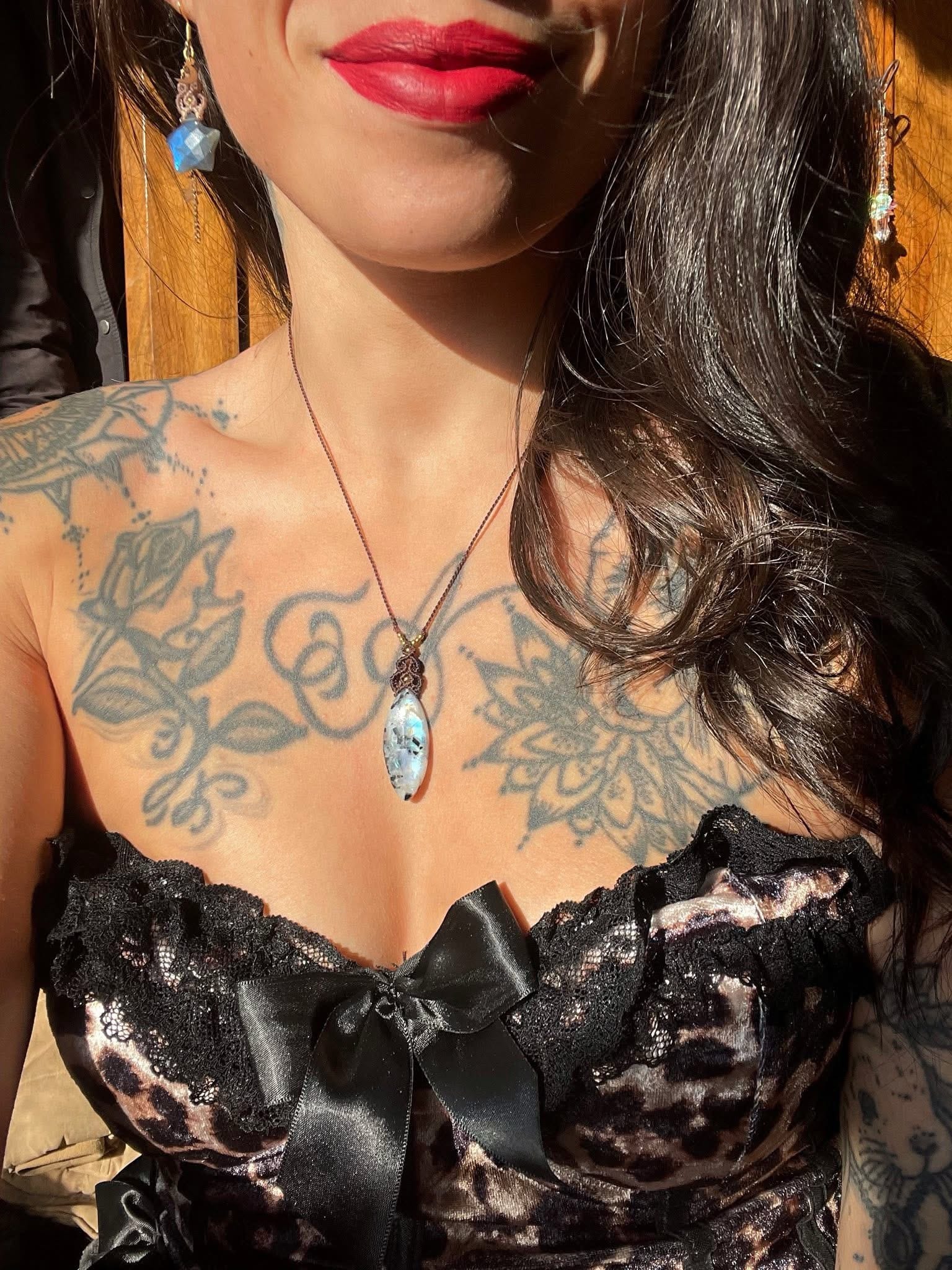 - Le pendentif est une Pierre de lune arc-en-ciel de haute qualité sertie en micro macramé fin.